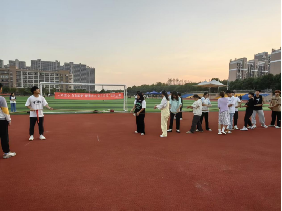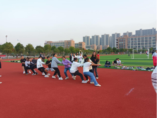 短短一条绳,却串起了参赛者的心,为同一目标而努力。本次大赛以班级为单位,每班都组建了一支强大的队伍,共9队。裁判一声令下,可见参赛者手臂青筋暴起,后倾身体,重心压低,力量通过粗绳汇聚。观众在一旁加油呐喊,甚至激动得跳起来。夕阳照耀大家的脸庞,闪烁着团体的光辉。