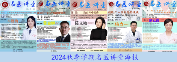 本学期的名医讲堂,更加注重深化与各附属医院的融合和资源对接,畅通信息交流,充分发挥讲堂在更新员工专业认知和提升专家在员工群体中知名度和影响力双重职能,分享主题更趋多元、分享嘉宾更具影响力、分享方式更加灵活。第41期项目,车媛梅主任“从传染到大感染科医生的从医之路”主题,是对既往分享主题的丰富和拓展,更新了同学们对感染性疾病和医者职业精神的认知。第42期项目,邀请到国内知名小儿外科专家黄金狮教授主讲“一个儿外科医生的成长”,激励同学们身处欠发达地区,只要坚持梦想、找准赛道、持续精进,也有可能走向更大的舞台,除人类之病痛、助健康之完美。第43期分享嘉宾陈文艳主任更是携带自己作为编者之一,由全国知名乳腺专家联名编撰的医生成长随笔集——《致奋斗中的你》书籍前来小蓝校区线下分享,这也是秋季学期首期线下分享,让同学们得以近距离感受名医的风采,同时分享嘉宾精彩、别样人生故事的娓娓道来对同学们规划自己未来从医之路带来新的启发。