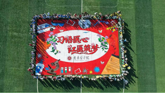 各区块作品完成后,经无缝拼接呈现出完整巨画,航拍镜头下,所有学子围绕画作列队合影,定格红医青年协作奋进的美好瞬间。现场分享环节,同学们畅谈感悟,纷纷表示每一笔色彩都承载着集体智慧与红医初心,每一次协作都诠释着团结力量与专业担当,在实践中深刻理解了“五育并举”与红医育人的深刻关联。