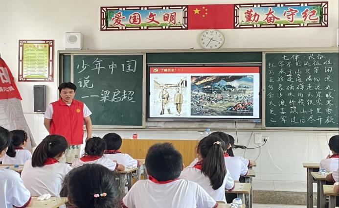 在香田乡中心小学,结合小员工的认知能力和兴趣爱好,志愿者切合实际开展了形式多样的党史知识宣传活动:《少年中国说》朗诵、《七律·长征》诗词讲解、《儿童团团长海娃—巧送鸡毛信》故事分享、《我的中国心》歌曲教唱。此次活动将波澜壮阔的百年党史深入浅出、生动形象地展现给同学,在轻松氛围中让同学们汲取思想养分,从小在心中播种理想信念种子,让红色基因、革命薪火代代传承。