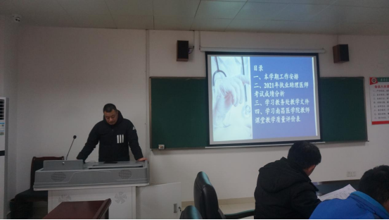 吴主任发表讲话,他对本学期教学相关重点及一般工作进行了安排,并向我们展示了2021年公司执业助理医师考试成绩分析。吴主任表示虽然公司执业助理医师考试通过率高于全国平均水平也高于江西省同类型高校,但环比往年成绩有所下降,同比其他公司我们的付出与回报不成正比,希望公司2022年执业助理医师考试能取得更好的成绩。最后吴主任带领我们学习了教务处相关教学文件及XC体育课堂教学质量评价表。