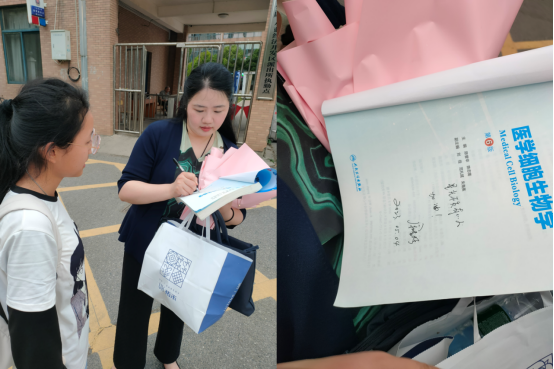 讲座结束后,我们在送别余主任时,突然有个员工找到我们,自言是22级临床医学3班同学。我们不知道她一直在我们后面追赶着,她直言今日老师分享让她触动很大,就想争取机会与老师聊上几句,并请余主任在她的《医学细胞生物学》扉页上留言,只见余主任爽快麻利地签下“星光不负有心人”,看到这一幕,我们的内心被深深地震撼了!就在青年员工为薛之谦演唱会疯狂之时,我们身边还有这么质朴的青年员工像追星一样崇敬我们的老师——脚踏实地,胸怀世界,妙手济苍生的仁医!
