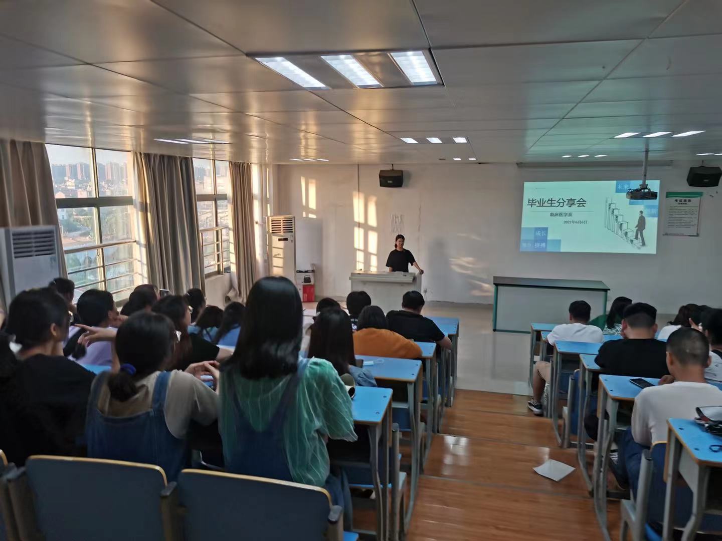 2017级临床医学刘惠讲话现场气氛轻松愉悦,同学们笑声掌声不断。学姐还强调“每个人最大的资源就是时间,找工作会有一个时间差,不要把全部精力集中于一处”